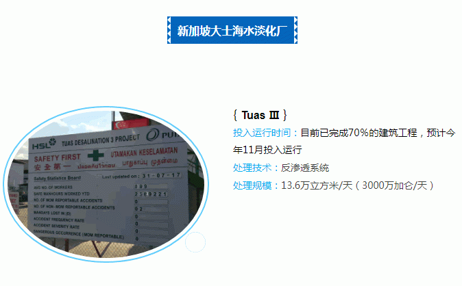 自2005年以來,新加坡已經(jīng)在大士(Tuas)啟用兩座海水淡化廠。新加坡的Tuas海水淡化工廠由Hgflua地方水處理公司設(shè)計(jì)和建造,該海水淡化工廠使用了“返滲透膜”技術(shù),可通過迫使海水穿過帶有微孔的薄膜而將海水中的鹽分濾除,能夠達(dá)到新加坡目前用水需求量的25%。